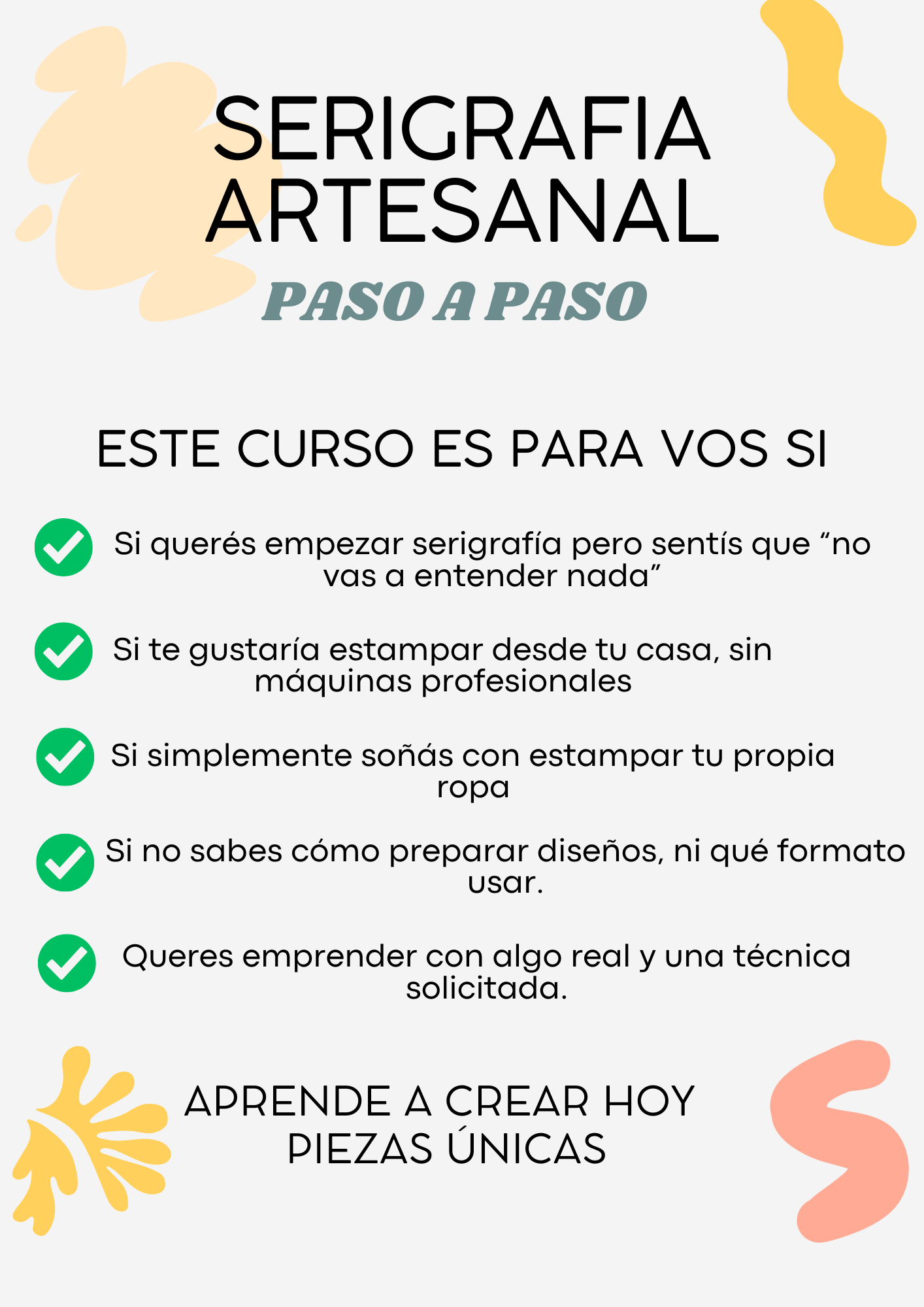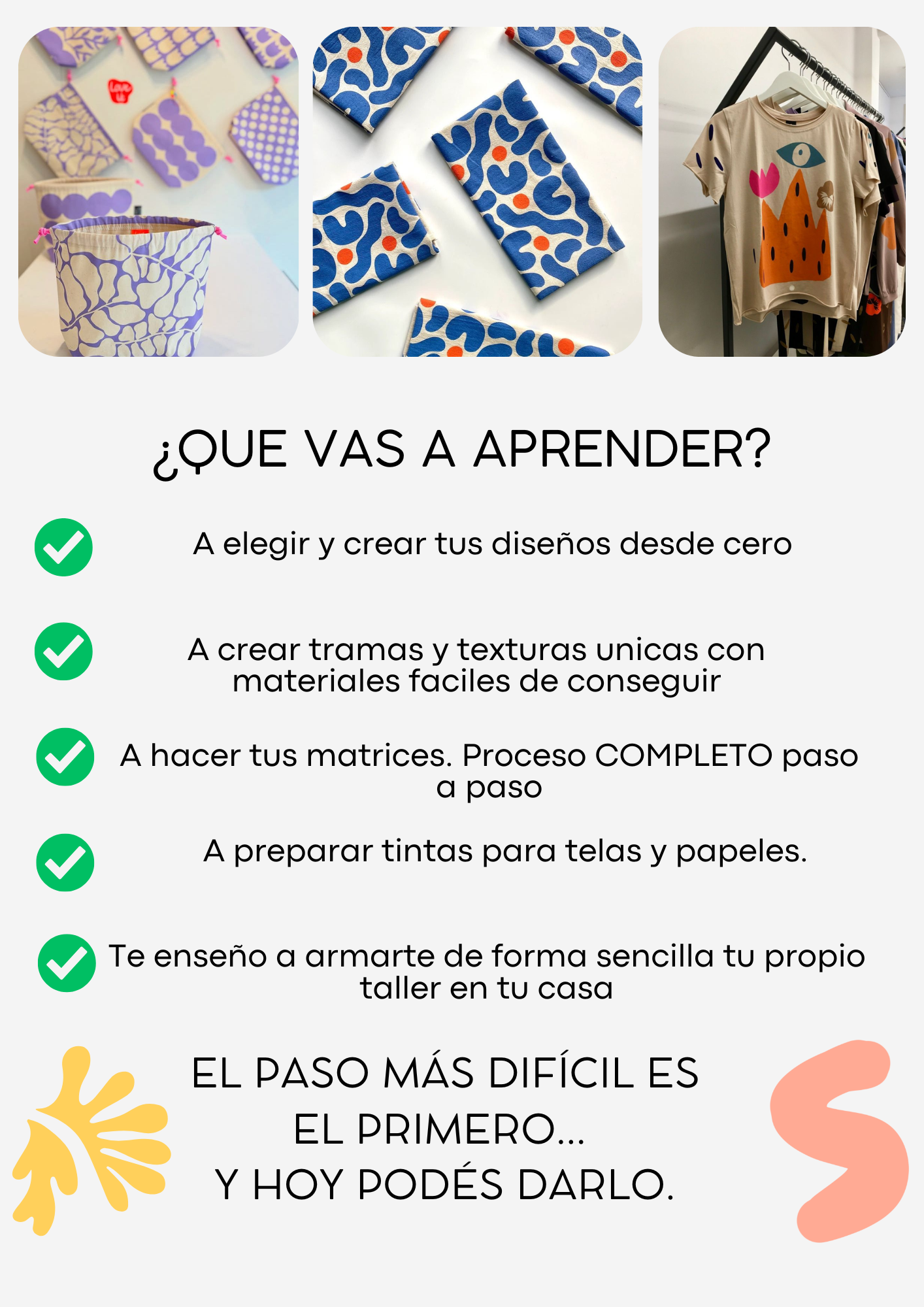 Te enseñamos todo paso a paso, desde cómo preparar los diseños, las estampas, tipos de tintas, hasta como armarte tu taller propio en casa